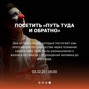 «Путь туда и обратно». Два актера-клоуна, которые постигают азы этого непростого искусства через познание самого себя. Спектакль-размышление о жизни и ее смысле – от рождения человека до его ухода.