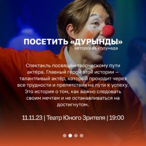 «Дурынды. Не-простой дивертисмент». Спектакль посвящён творческому пути актёра. Это история о том, как важно следовать своим мечтам и не останавливаться на достигнутом.