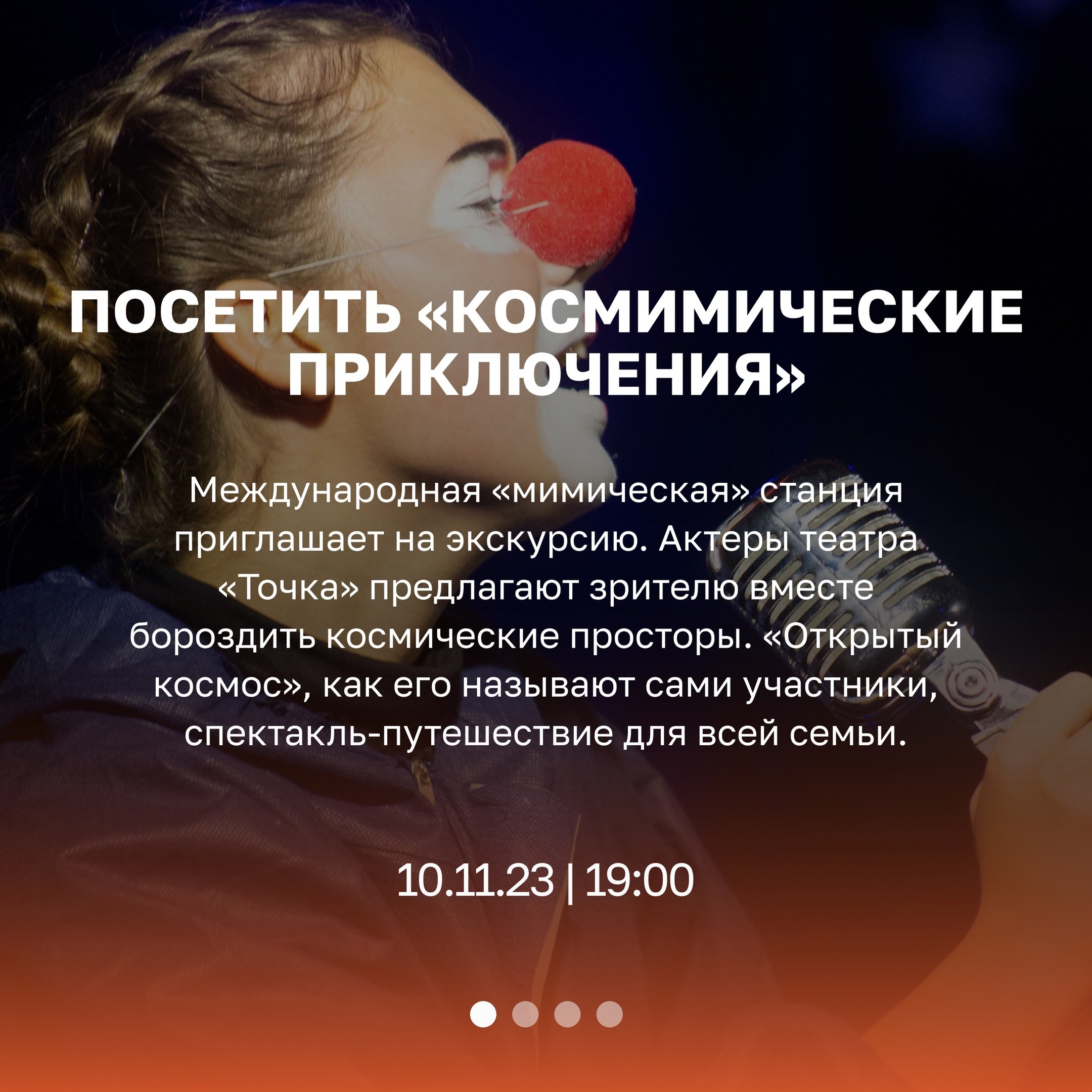 «Космимические приключения». Международная «мимическая» станция приглашает на экскурсию. Актеры театра «Точка» предлагают зрителю вместе бороздить космические просторы.