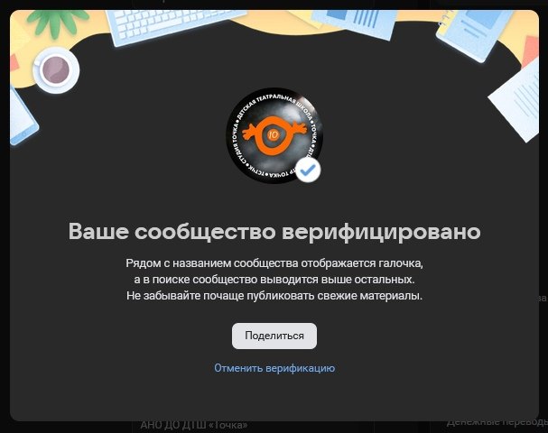 Мы рады сообщить, что сообщество театра «Точка» в сети ВКонтакте вновь верифицировано! Это означает, что наша страница подтверждена и является официальным представителем театра «Точка» в социальной сети.
