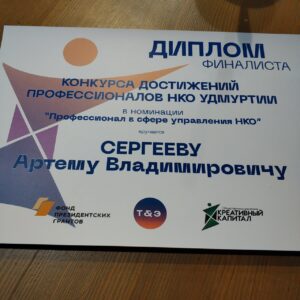 Артем Сергеев в номинации «Профессионал в сфере управления НКО» в конкурсе «Призвание – НКО» имени А.Ф. Радевича представляет автономную некоммерческую организацию «Центр театрального искусства «Точкин дом». В финале стал призером.