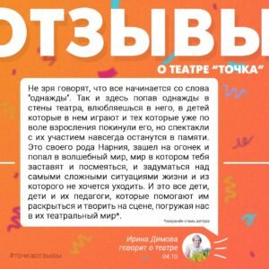 Отзывы о реализации проекта «Новая театральная школа «Точка» с использованием гранта, направленного на реализацию проектов в области Культуры, Искусства и креативных (творческих) индустрий, представленного Президентским фондом культурных инициатив.