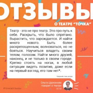 Отзывы о реализации проекта «Новая театральная школа «Точка» с использованием гранта, направленного на реализацию проектов в области Культуры, Искусства и креативных (творческих) индустрий, представленного Президентским фондом культурных инициатив.