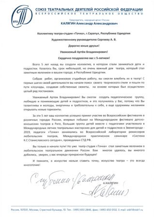 Приветствие «Точке» от Председателя СТД РФ, Народного артиста РФ Калягина А.А.