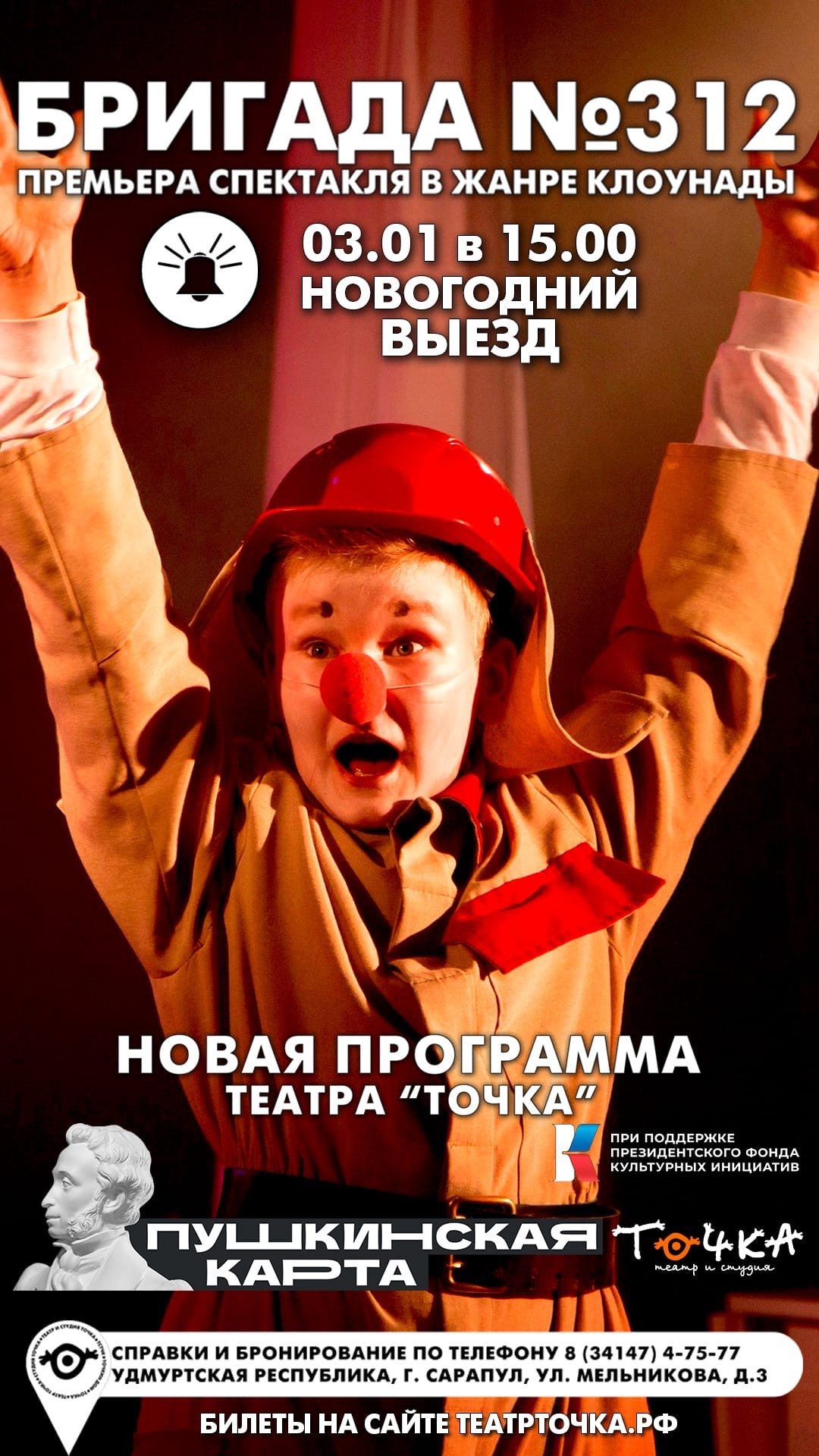 Театр «Точка» предлагает получить новогоднее настроение и зарядиться на весь наступивший год положительными эмоциями, благодаря интерактивному спектаклю в жанре клоунады «Бригада №312», 0+.