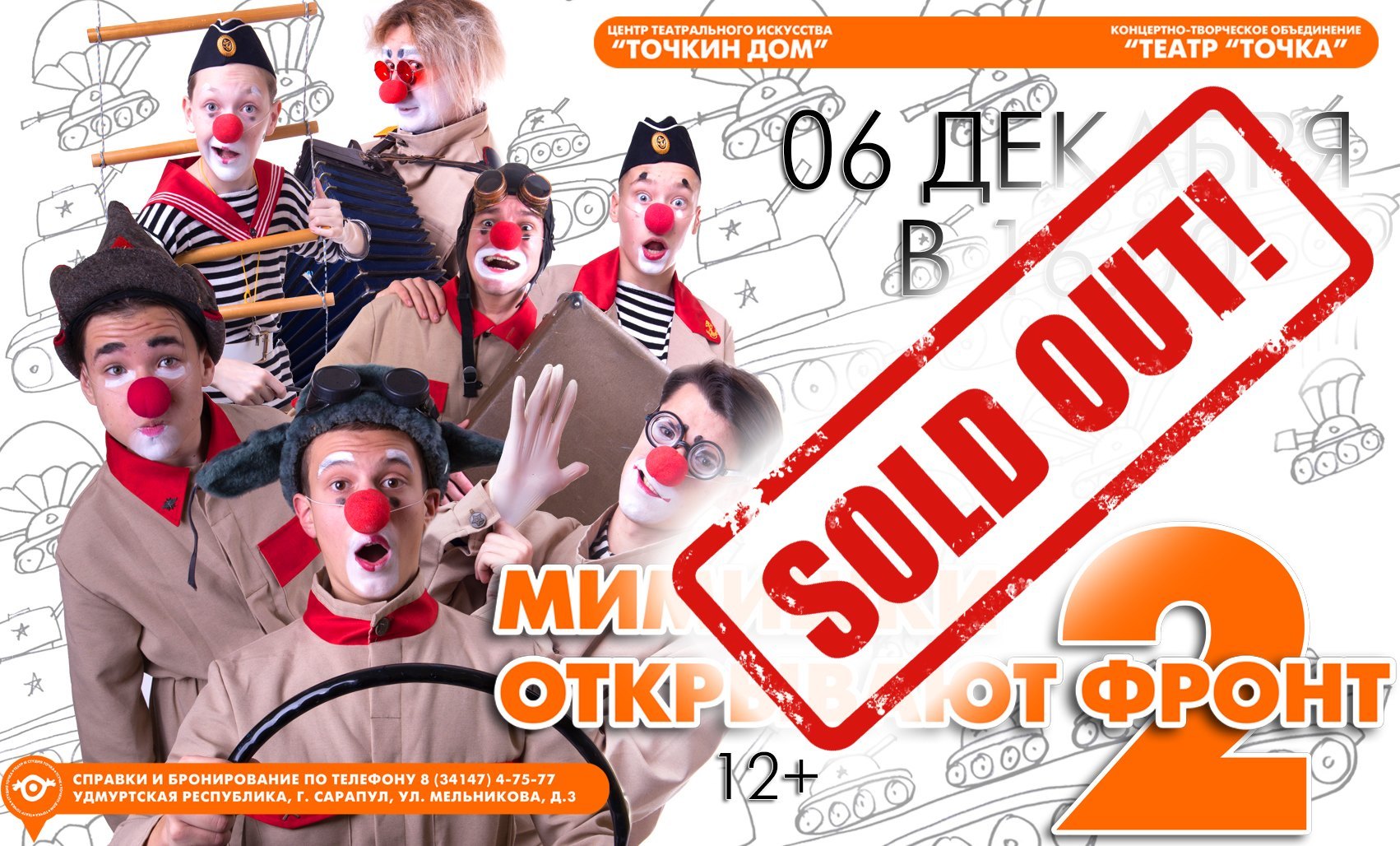 Театр Точка, г. Сарапул > Новости > Свободных билетов на 6 декабря нет. Опубликовано: 4 декабря 2020 Рубрика: Новости Свободных билетов на 6 декабря нет. Дорогие наши зрители! Бронирование билетов на спектакль 6 декабря завершено. Свободных мест больше нет, но не исключено, что кто-то откажется. Поэтому звоните в воскресенье 4-75-77 или бронируйте скорее на 13 декабря!