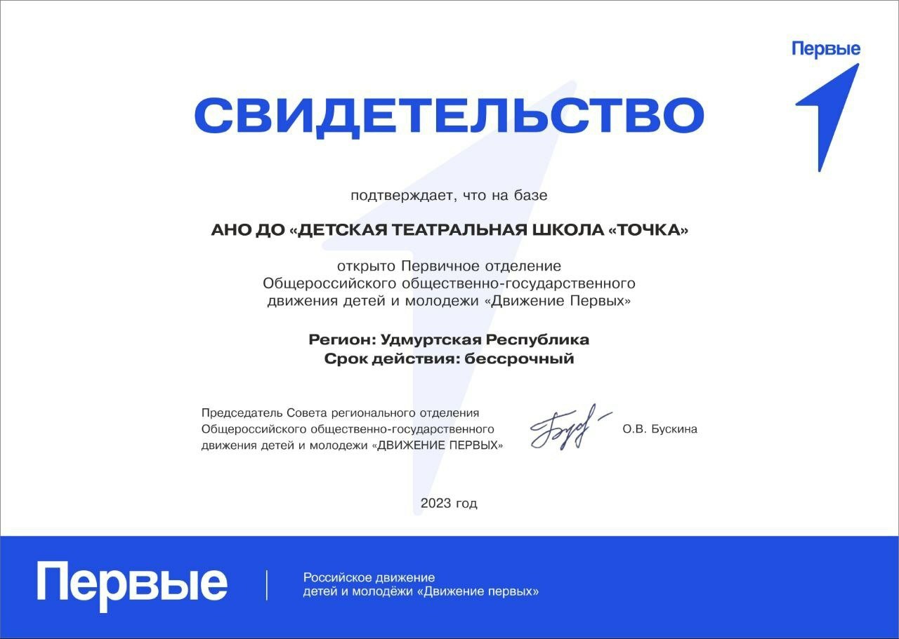 Наша первая профильная детская театральная школа в Удмуртии в числе первых открыла первичное отделение Российского движения детей и молодежи «Движение первых»!