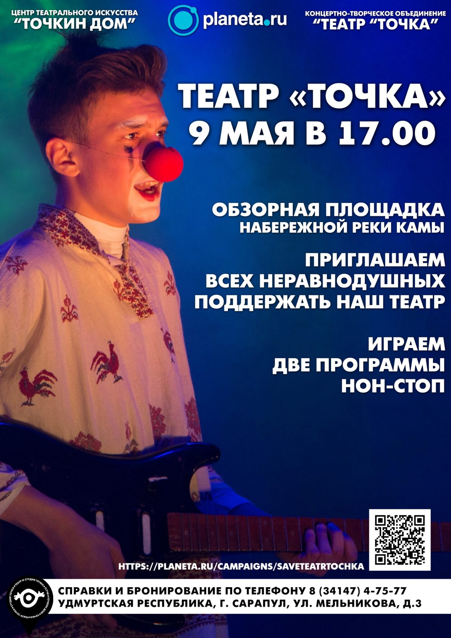 Сколько это стоит? В этот день «Точка» играет свои спектакли абсолютно бесплатно, но, если у вас есть желание поддержать театр в это непростое время, вы можете перейти по ссылке, где мы совместно с Planeta.ru организовали сбор средств, чтобы спасти и сохранить наш уникальный театр: