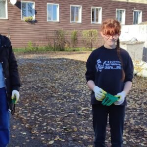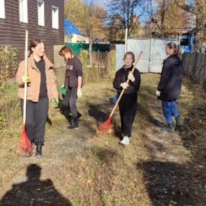 Алена Колчина Алина Вершинина Фима Цурканова Мария Ляпунова занимались осенней уборкой территории.