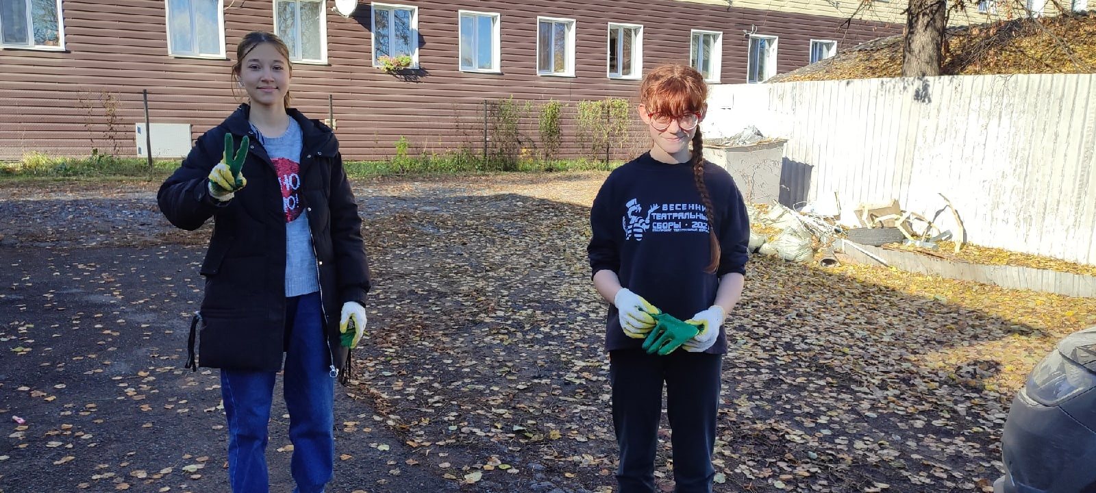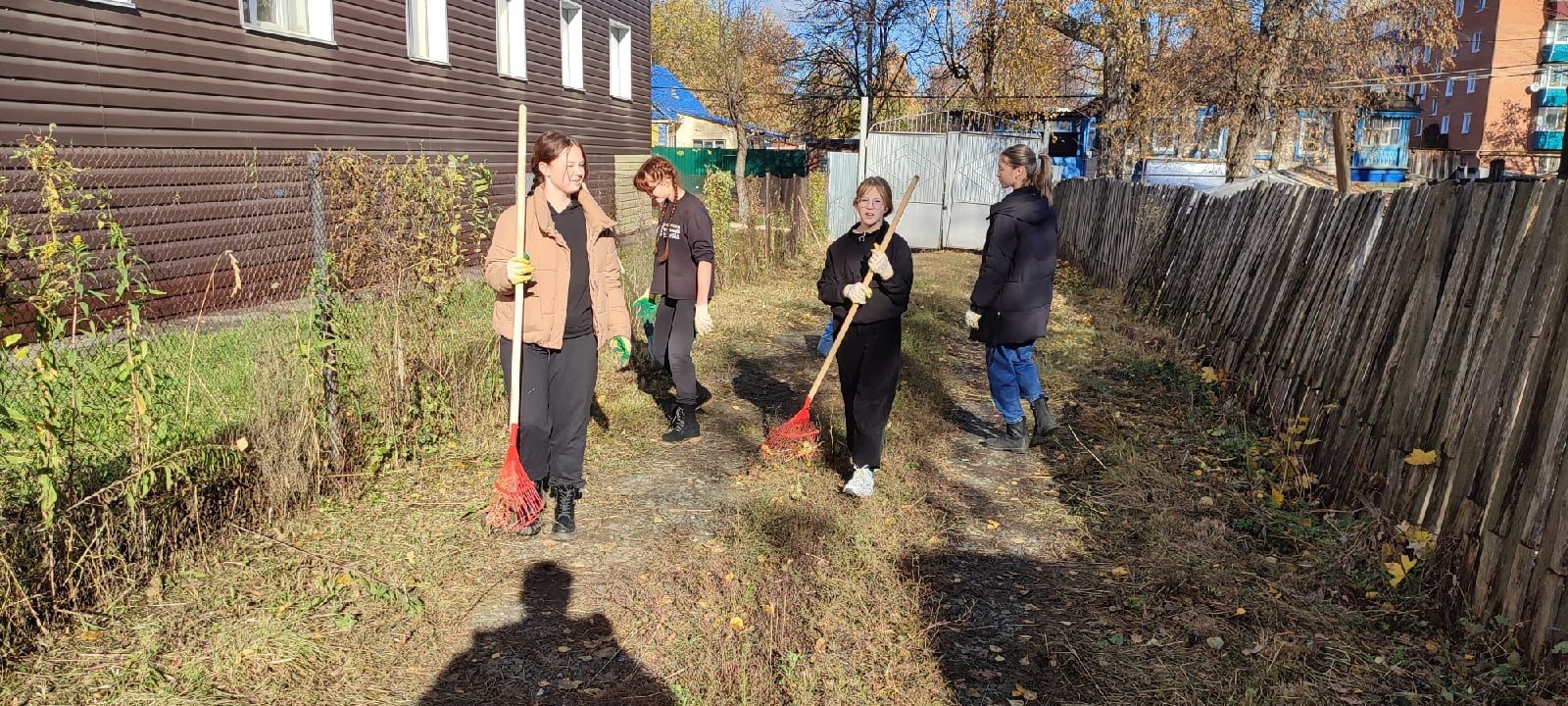 Алена Колчина Алина Вершинина Фима Цурканова Мария Ляпунова занимались осенней уборкой территории.