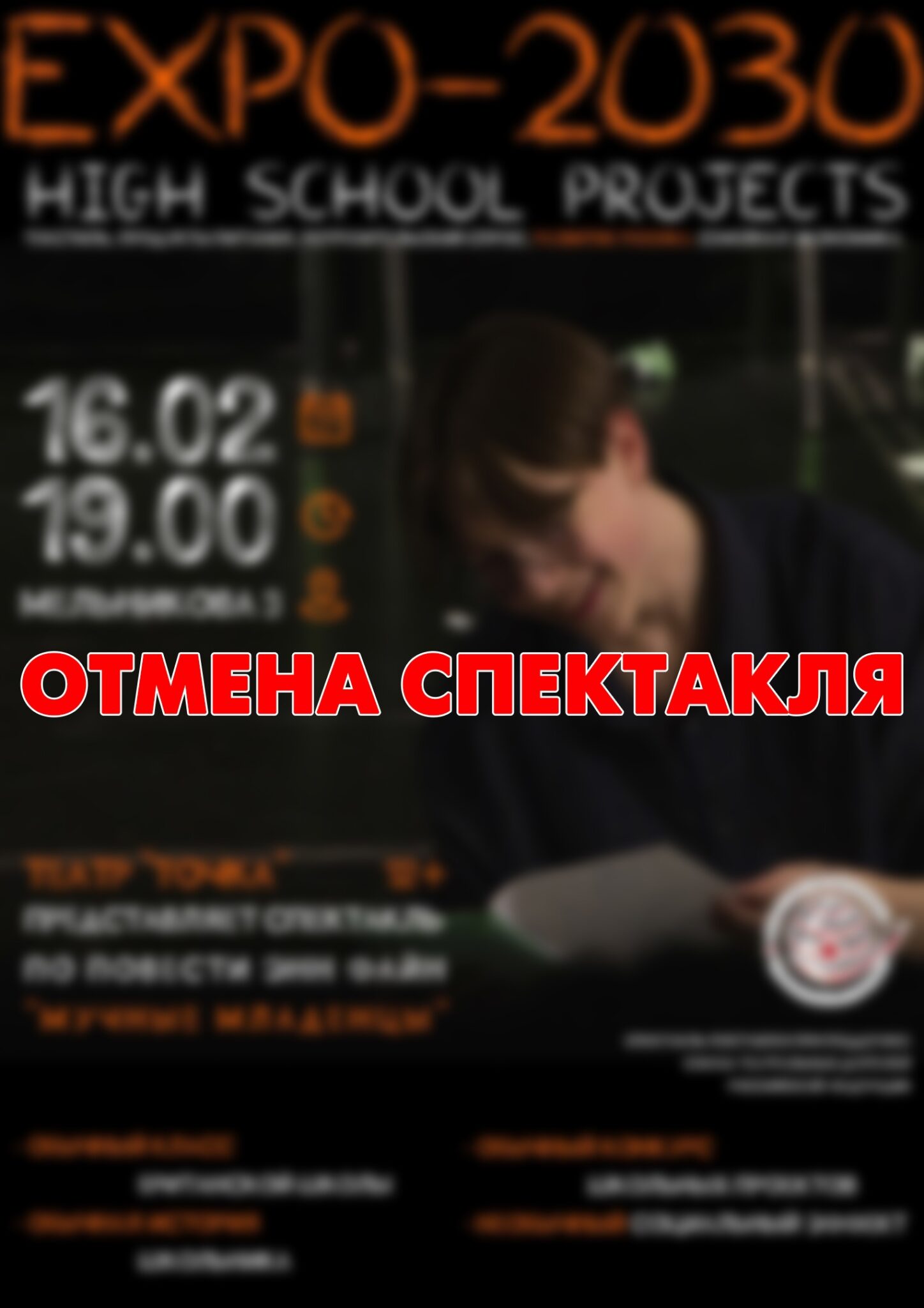 С сожалением сообщаем, что спектакль «Экспо-2030» театра «Точка» отменен из-за непредвиденных обстоятельств. Мы приносим свои извинения за возможные неудобства.