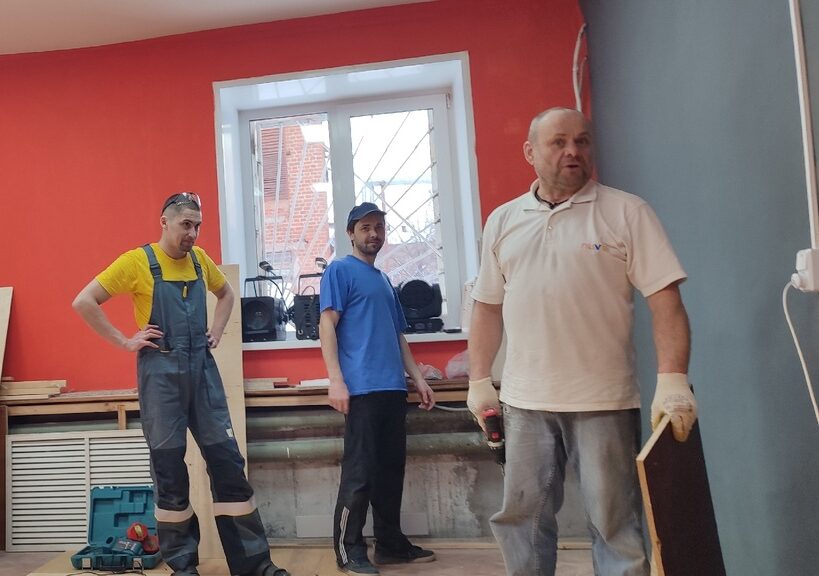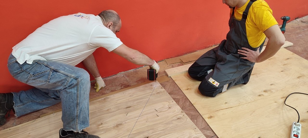Папа Ильдара — Руслан, папа Саши и Полины — Павел, папа Фени и Семëна — Сергей уложили основу из фанеры для пола в театральной мастерской №1. После выстилки линолеума выявились особенности рельефа, которые пришлось учесть и застелить пол фанерой предварительно.